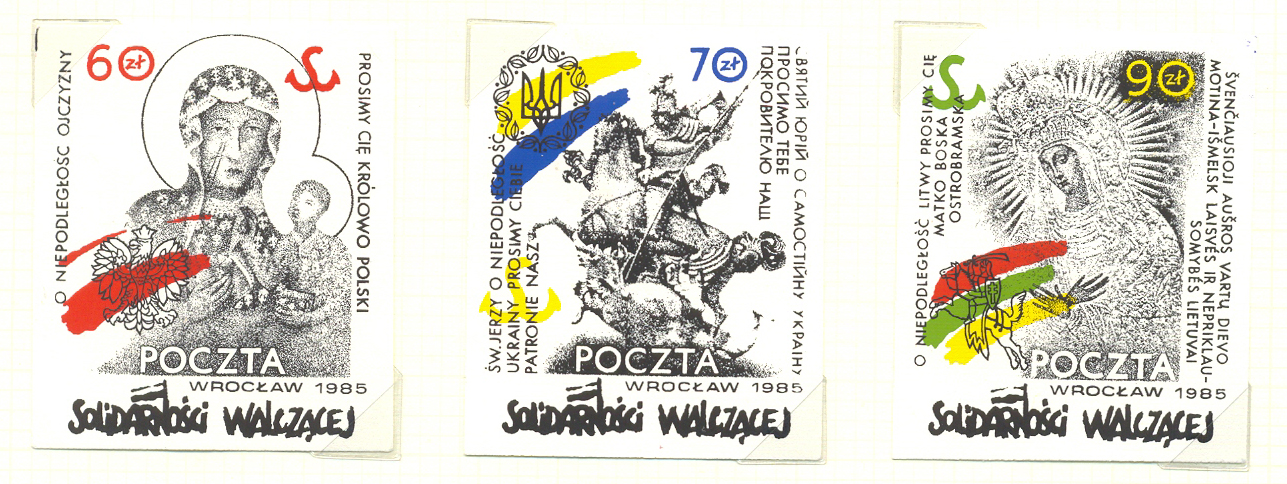 „Św. Jerzy, o niepodległość Ukrainy prosimy Ciebie, patronie nasz” – taki tekst zamieszczono obok wizerunku świętego na znaczku „Solidarności Walczącej” latem 1985 r. To jeden z trzech znaczków niepodległościowego bloczka filatelistycznego. Obok św. Jerzego widnieje Matka Boża Ostrobramska z polskim i litewskim napisem „Oniepodległość Litwy, prosimy Cię, Matko Boska Ostrobramska” oraz Jasnogórska Czarna Madonna z inskrypcją „O niepodległość Ojczyzny prosimy Cię, Królowo Polski”. Na bloczku znalazły się religijne symbole narodów, które wchodziły w skład I Rzeczypospolitej. To filatelistyczne i drukarskie cudeńko było i wciąż jest manifestacją wspólnych dążeń niepodległościowych Polski, Litwy i Ukrainy.
