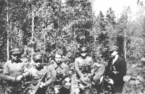 Bronius Saveikis (drugi z lewej) w otoczeniu partyzantów litewskich (Bronius Kaselionis, „Dainavos partizanai. Saruno rinktine dokumentai ir prisiminimai”, Vilnius 1999)
