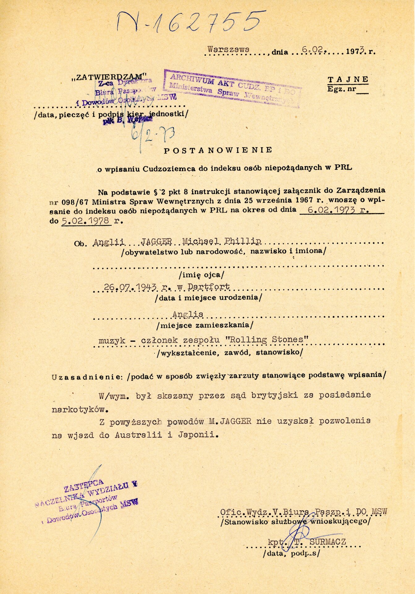 Czy w aktach IPN można znaleźć informację o Micku Jaggerze? Odpowiedź na to pytanie wydawałaby się oczywiście negatywna, chyba, że przeprowadzający żmudną kwerendę badacz liczył na znalezienie jakichkolwiek informacji o warszawskim koncercie słynnej grupy The Rolling Stones w Warszawie z kwietnia 1967 roku. Tymczasem okazuje się, że choć źródła milczą na temat tego konkretnego wydarzenia, to niejaki Michael Phillip Jagger, urodzony 26.07.1943 r. w Dartford, figuruje w IPN-owskich archiwach. Za sprawą nieznanego wnioskodawcy (brak w aktach odpowiedniego pisma) i wniosku kapitana Surmacza z Wydziału V Biura Paszportów i Dowodów Osobistych wokalista Rolling Stonesów znalazł się bowiem w… „Indeksie osób niepożądanych w PRL”.