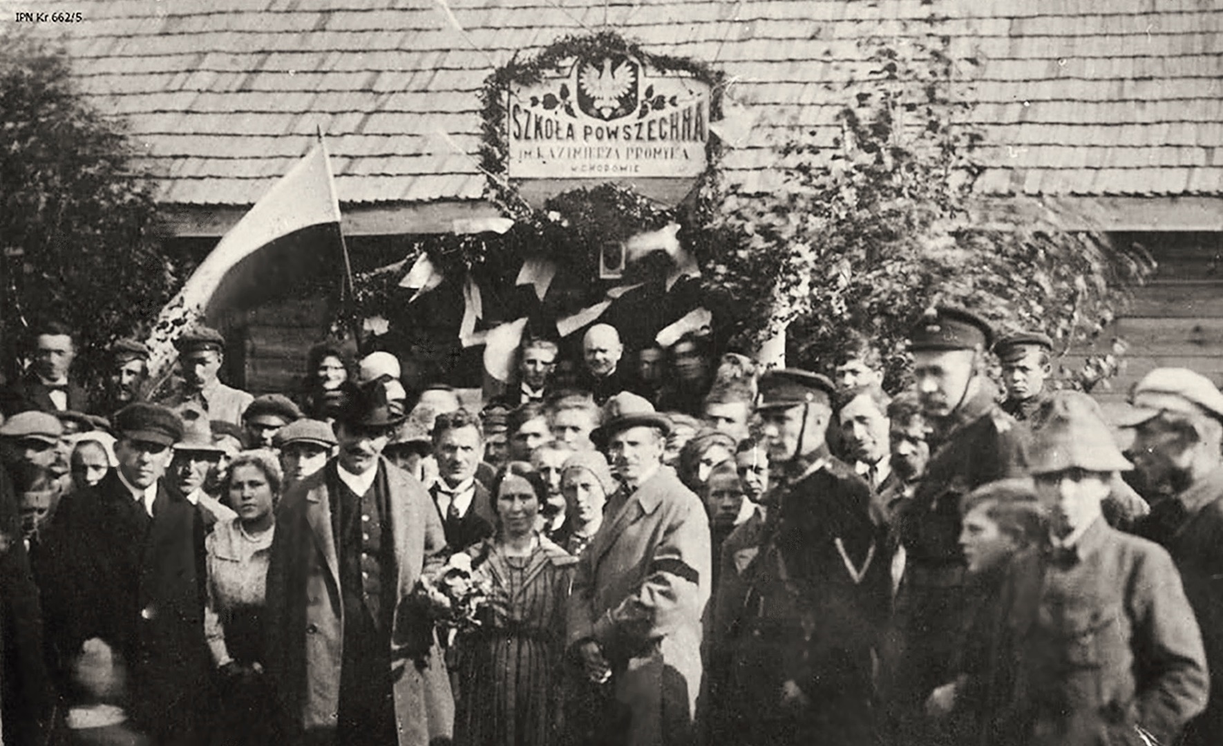 Wincenty Witos (z bukietem) na fotografii zbiorowej przed wejściem do Szkoły Powszechnej im. Kazimierza Promyka w Chodowie (fot. z zasobu AIPN)