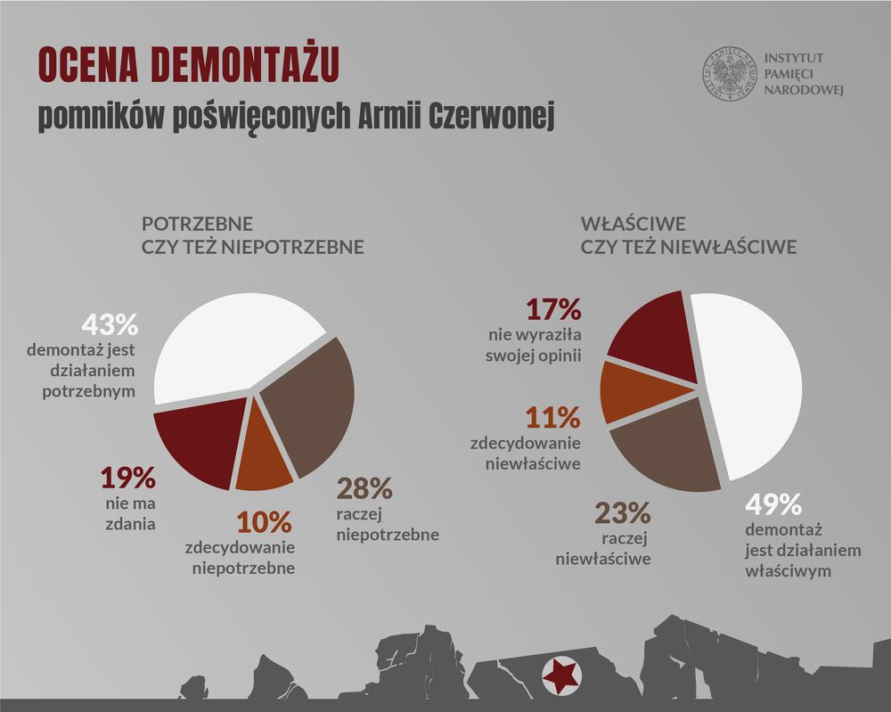 Po apelu Prezesa IPN dr Karola Nawrockiego, z 4 marca 2022 r., z pozostałych w Polsce 60 komunistycznych obiektów propagandowych do połowy listopada zdemontowano 25, a usunięcia kolejnych są w planach. Należy podkreślić, że demontaż komunistycznych obiektów propagandowych spotkał się z pozytywną oceną Polaków. Przeprowadzone na początku listopada 2022 r. badania Kantar Public, na zlecenie IPN potwierdzają, że demontaż komunistycznych obiektów propagandowych w odczuciu społecznym jest działaniem właściwym (49% Polaków tak uważa). Za zdecydowanie niewłaściwe uważa go jedynie 11% badanych. Potrzebę takich działań widzi 43% badanych, jedynie 10% z nich uważa to za zdecydowanie niepotrzebne. Z kolei blisko połowa badanych – 45%, dobrze ocenia działania Instytutu Pamięci Narodowej związane z demontażem komunistycznych obiektów propagandowych lub innych miejsc poświęconych Armii Czerwonej, które są na terenie Polski. Jedynie 8% badanych zdecydowanie źle oceniło działania IPN.
