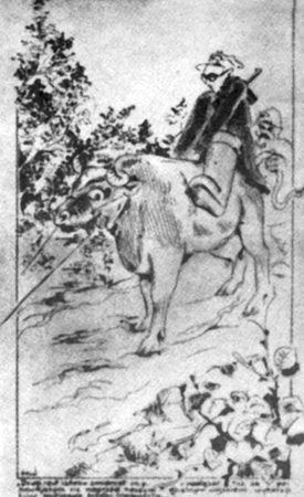 w rejonie Kruszyńca do lasów szackich na grzbiecie krowy, autor karykatury nieznany,