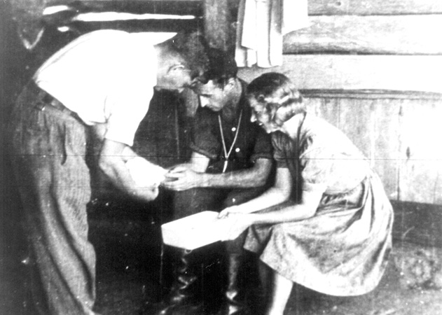 Doktor Kazimierz Gradziński „Helios” opatruje rannego w rękę Jerzego Wosia „Farys”, obok NN sanitariuszka, ze zb. Andrzeja Zagórskiego |