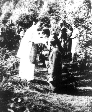 Ksiądz Stanisław Bartosz „Mieczyk” udziela komunii w czasie mszy polowej na Polanie Kałżówka,