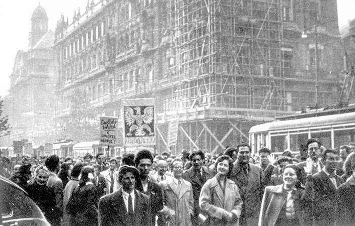 Manifestanci na ulicach Budapesztu z hasłem "Solidarność z Polskim Narodem", Budapeszt 23 października 1956 r., fot. Marian Dudziński