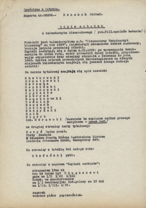 Notatka zespołu dr Jana Robla na temat dokumentów znalezionych przy zwłokach numer 2595 – 6 kart.