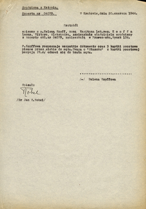 Notatka zespołu dr Jana Robla na temat dokumentów znalezionych przy zwłokach numer 4079 - 3 karty.