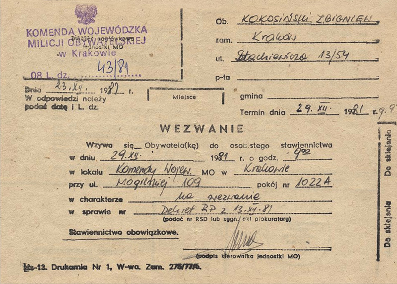 Wezwanie na komendę MO działacza NZS z Politechniki Krakowskiej Zbigniewa Kokosińskiego,