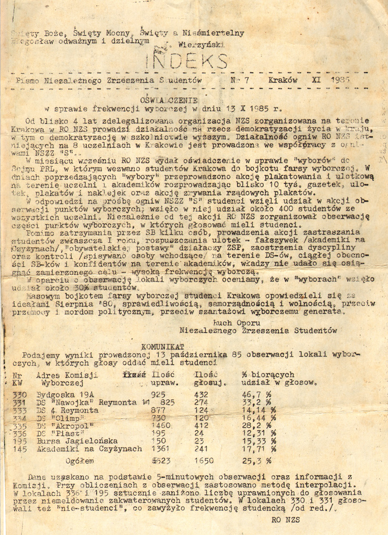 Oświadczenie Ruchu Oporu NZS w sprawie frekwencji podczas wyborów parlamentarnych, „Indeks”, listopad 1985 r.
