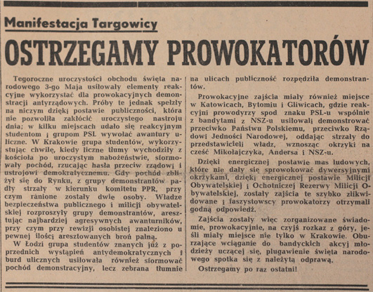 Propagandowe artykuły zamieszczane w maju 1946 r. w „Echu Krakowa”.