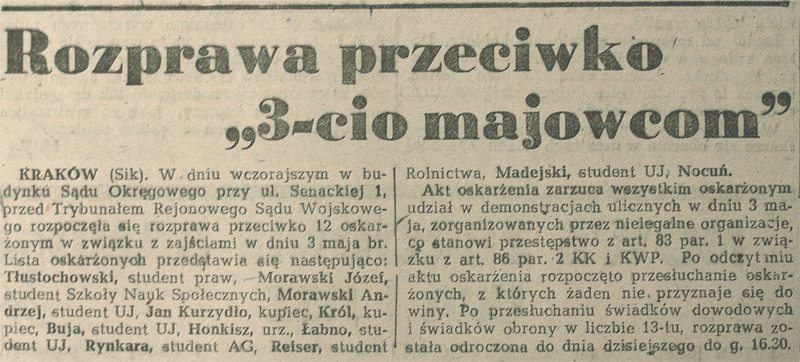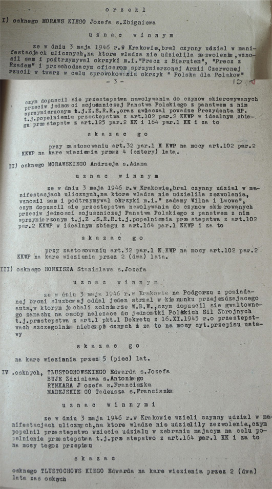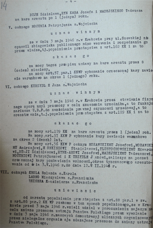 Fragment wyroku w sprawie studentów oskarżonych o uczestnictwo w manifestacji 3 maja, 12 lipca 1946 r. (zbiory IPN).