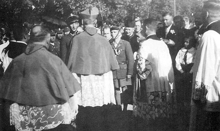 Dowódca kompanii honorowej Wojska Polskiego składa meldunek ks. bp. Stefanowi Wyszyńskiemu,