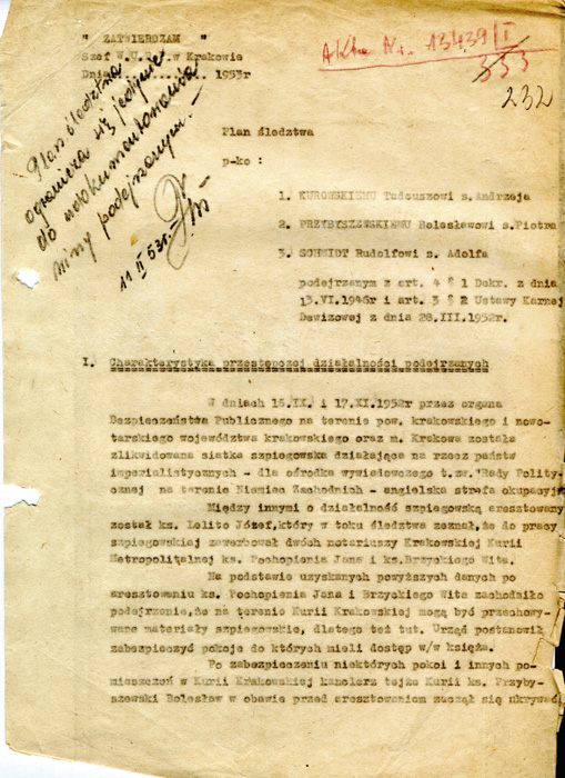 Plan śledztwa przeciwko księżom Bolesławowi Przybyszewskiemu, Tadeuszowi Kurowskiemu i Rudolfowi Schmidtowi. Ostatecznie jednak nie wytoczono im procesu i zostali zwolnieni z aresztu po ośmiu miesiącach śledztwa w lipcu 1953 r.