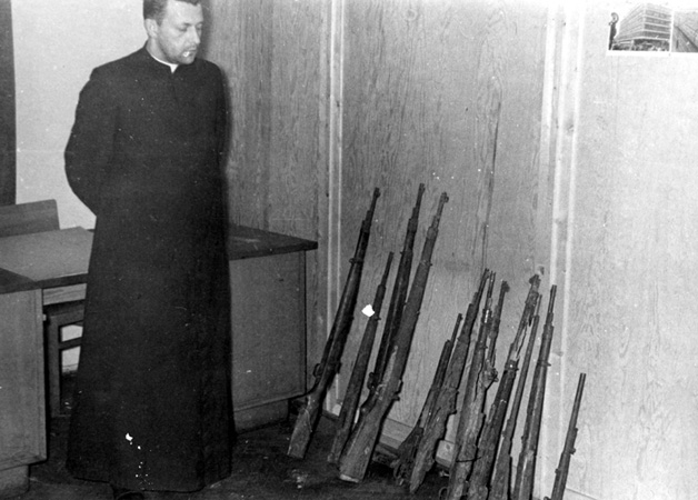 Ks. Rudolf Schmidt z bronią wyłowioną z rzeki Rudawy.