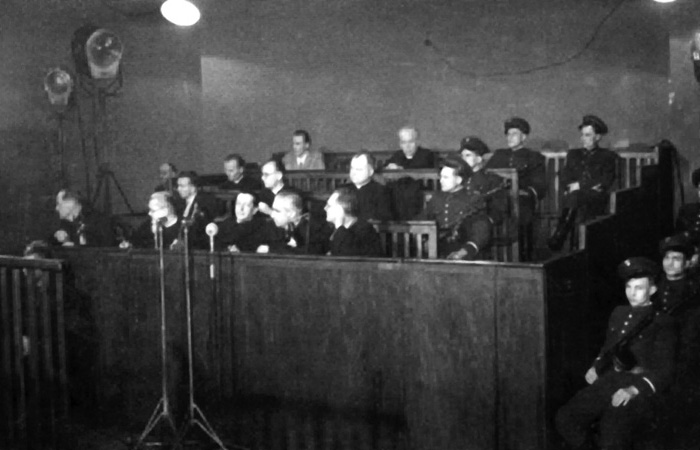 Ława oskarżonych w procesie ks. Lelity. W ostatnim rzędzie od lewej: