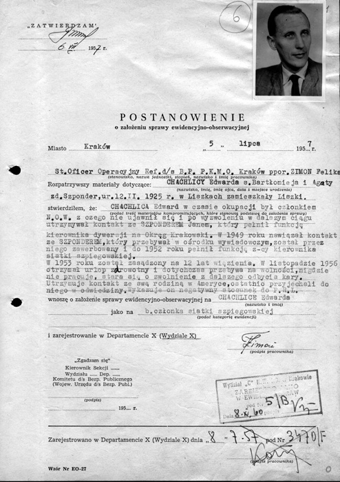 Kolejne postanowienia o założeniu spraw ewidencyjno-obserwacyjnych przeciwko Edwardowi Chachlicy – zwolnionemu z więzienia 22 listopada 1956 r.