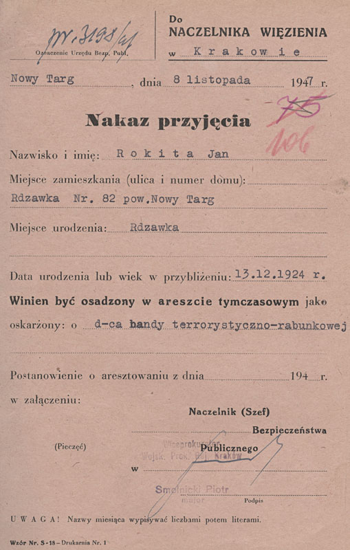 Nakaz przyjęcia Jana Rokity do aresztu, Nowy Targ,