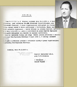 | Skierowanie absolwenta organizowanej przez PPR Szkoły Partyjnej do pracy w UB | Opinia Komitetu Zakładowego ZMS w Krynicy wystawiona dla starającego się o pracę w SB Mikołaja Topuziaka |