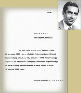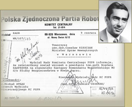 | Zatwierdzenie przez Komitet Centralny PZPR powołania Bogdana Kasprzyka na zastępcę komendanta wojewódzkiego MO ds. SB w Nowym Sączu | Mianowanie przez Czesława Kiszczaka Bogdana Kasprzyka na stanowisko zastępcy komendanta wojewódzkiego MO ds. SB w Nowym Sączu |