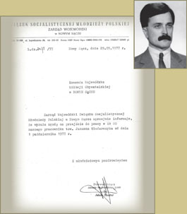 | System nomenklatury w stosunku do kluczowych zdaniem partii stanowisk w aparacie represji utrzymał się do końca PRL-u | Wielu funkcjonariuszy rekrutowało się spośród aktywu komunistycznych organizacji młodzieżowych. Zgoda Zarządu Wojewódzkiego ZSMP na przejście Janusza Włodarczyka do pracy w SB |