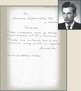 | Podanie Juliana Świątka o przyjęcie do PUBP w Tarnowie | Podanie Jana Murczka o przyjęcie do SB w Komendzie Powiatowej MO w Tarnowie |