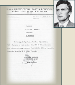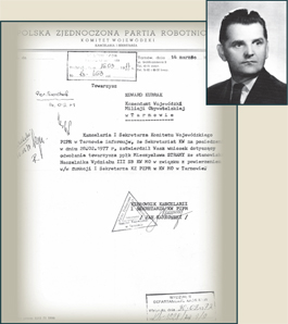 | Zatwierdzenie przez Komitet Centralny PZPR powołania Józefa Schillera na zastępcę komendanta wojewódzkiego MO ds. SB w Tarnowie | System nomenklatury w stosunku do kluczowych stanowisk w aparacie represji utrzymał się do końca PRL-u. Akceptacja egzekutywy KW PZPR w Tarnowie z 1988 r. dotycząca powołania Ryszarda Góry na stanowisko Naczelnika Wydziału VI SB WUSW w Tarnowie |