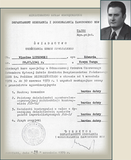 | Prośba Naczelnika Wydziału III SB Romana Waśkowicza o skierowanie na przeszkolenie w Związku Sowieckim | Świadectwo ukończenia przez Wiesława Lipkowskiego Kursu Specjalnego w Wyższej Szkole KGB im. Feliksa Dzierżyńskiego w ZSRS |