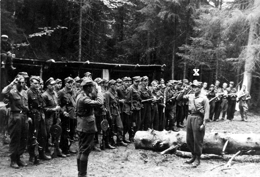 Apel w obozie oddziału ochrony sztabu mjra „Ognia” (zaznaczony „×”).